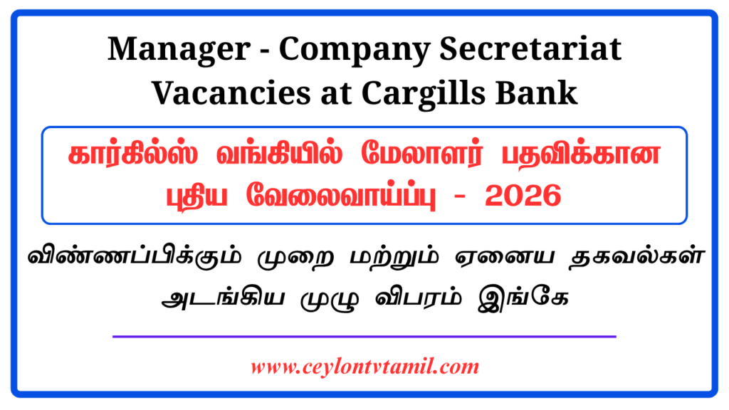 இலங்கையின் வங்கித்துறையில் மிக வேகமாக வளர்ந்து வரும் மற்றும் நவீன தொழில்நுட்பங்களை உட்புகுத்தி வரும் ஒரு முன்னணி வணிக வங்கியாக கார்கில்ஸ் வங்கி (Cargills Bank PLC) திகழ்கிறது. வங்கியின் நிருவாகக் கட்டமைப்பு மற்றும் சட்ட ரீதியான விதிமுறைகளை (Compliance) சீராகப் பேணுவதற்காக, தகுதியுள்ள நிபுணர்களிடமிருந்து மேலாளர் – நிறுவனச் செயலகம் (Manager – Company Secretariat) பதவிக்கான விண்ணப்பங்கள் கோரப்படுகின்றன.