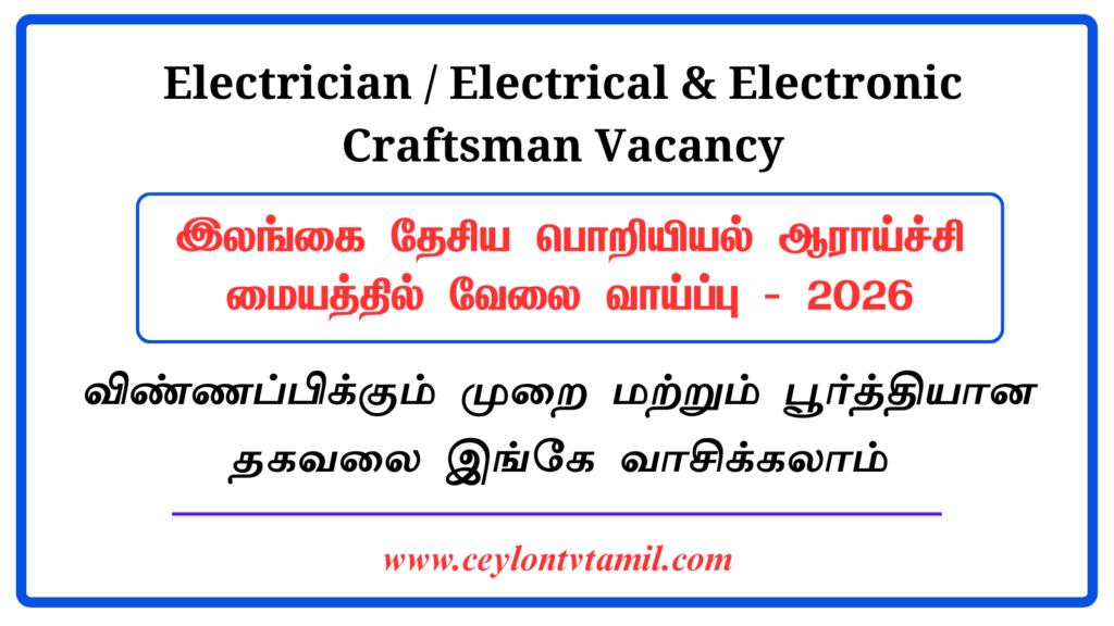 இலங்கை அரசாங்கத்தின் அறிவியல் மற்றும் தொழில்நுட்ப அமைச்சின் கீழ் இயங்கும் மிக உயரிய ஆராய்ச்சி நிறுவனமான தேசிய பொறியியல் ஆராய்ச்சி மற்றும் அபிவிருத்தி மையம் (NERDC), தற்போது தனது ஏக்கலை (Ekala) தொழிற்சாலைப் பிரிவில் நிலவும் தொழில்நுட்பப் பணியாளர் வெற்றிடங்களை நிரப்புவதற்குத் தகுதியுள்ள இலங்கைப் பிரஜைகளிடமிருந்து விண்ணப்பங்களைக் கோருகின்றது. நீங்கள் மின்சாரத் துறையில் ஒரு சிறந்த எதிர்காலத்தை உருவாக்க விரும்பினால், இந்த அரசாங்கப் பணி வாய்ப்பு உங்களுக்கு ஒரு அரிய சந்தர்ப்பமாகும். குறிப்பாக தொழில்முறை அனுபவம் மற்றும் அரச நிறுவனமொன்றில் பணியாற்றிய சான்றிதழ் தேவைப்படும் இளைஞர்களுக்கு இது ஒரு பொன்னான வாய்ப்பாக அமையும்.