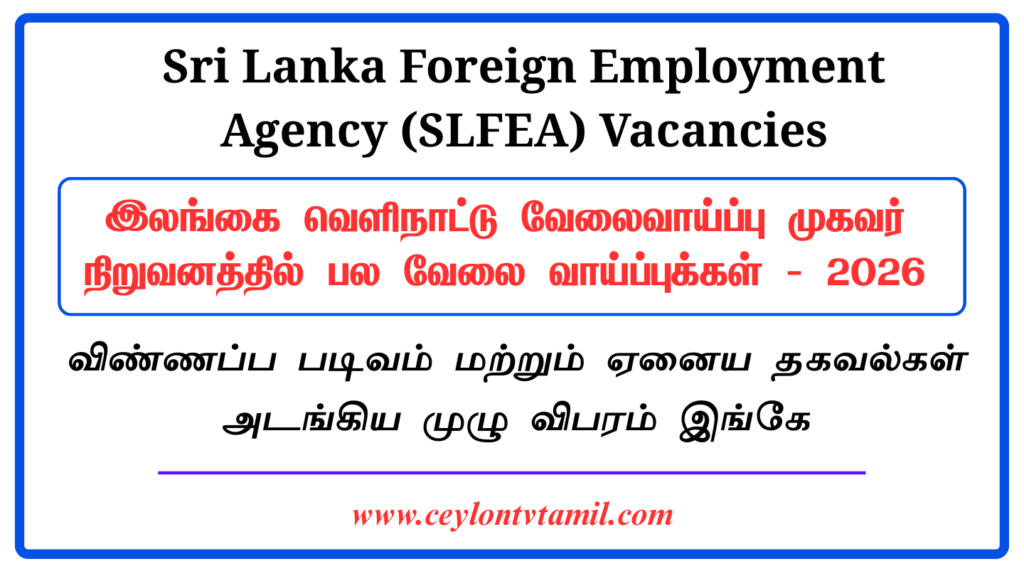 வெளிநாட்டு அலுவல்கள், வெளிநாட்டு வேலைவாய்ப்பு மற்றும் சுற்றுலா அமைச்சின் கீழ் இயங்கும் இலங்கை வெளிநாட்டு வேலைவாய்ப்பு முகவர் நிறுவனம் (SLFEA), தனது நிருவாகக் கட்டமைப்பை வலுப்படுத்துவதற்காக பல்வேறு துறைகளில் நிலவும் வெற்றிடங்களுக்குத் தகுதியுள்ள இலங்கைப் பிரஜைகளிடமிருந்து விண்ணப்பங்களைக் கோருகிறது. இது இலங்கை வெளிநாட்டு வேலைவாய்ப்புப் பணியகத்தின் முழுமையான அரசுக்கு சொந்தமான ஒரு நிறுவனமாகும். தகுதியுள்ள விண்ணப்பதாரர்களுக்கு ஒரு பாதுகாப்பான மற்றும் கௌரவமான தொழில் வாய்ப்பு இங்கு காத்திருக்கிறது.